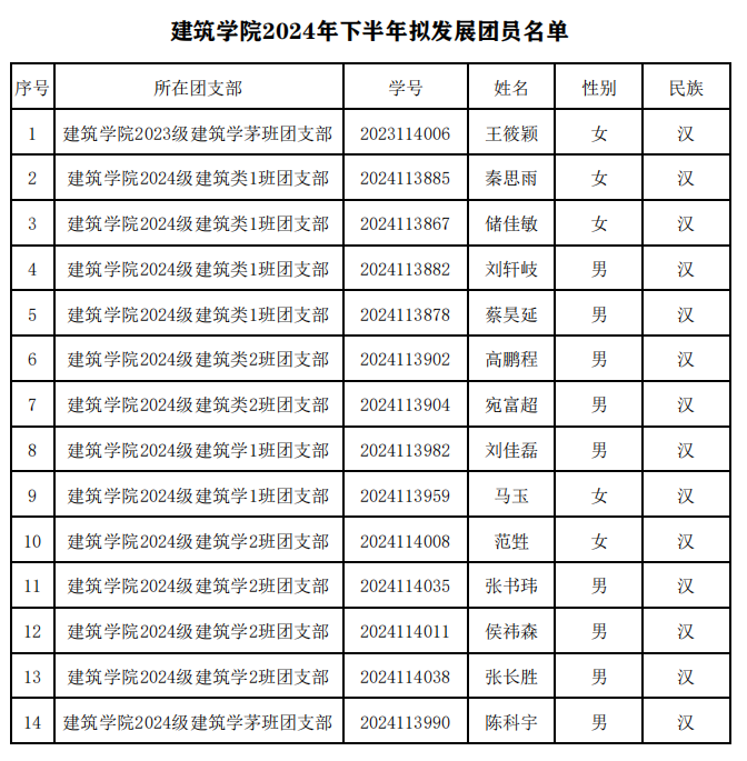根据《中国共产主义青年团章程》有关规定,按照《关于加强新形势下发展团员和团员管理工作的意见》和《中国共产主义青年团发展团员工作细则》要求,经学生个人申请、团支部教育培养考察、二级团组织审核团支部推荐意见和相关材料,拟推荐王筱颖等14名同学为本次发展团员对象,具体名单见下表。