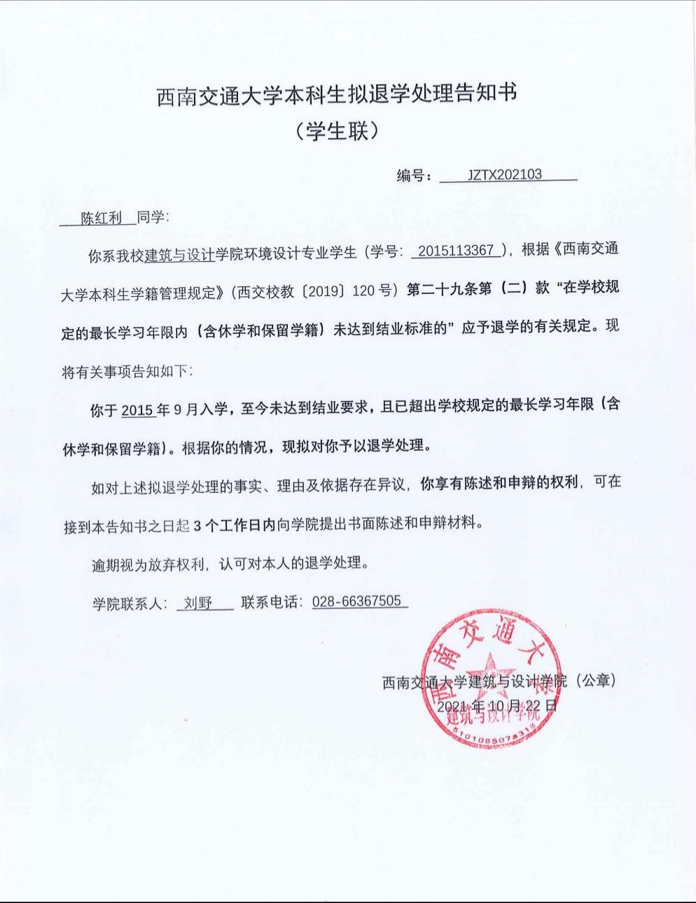 本科生学籍管理规定》第二十九条第(二)款 “在学校规定的最长学习年限内(含休学和保留学籍)未达到结业标准的” 应予退学的有关规定,拟对下列同学进行退学处理,学院通过电话、网络、邮件等方式无法与本人取得联系,特发布此公告,具体内容见附件。自本公告发出之日起满10日即视为送达,如果对上述拟退学处理有异议,可在公告期满3个工作日内向学院进行陈述和申辩。
