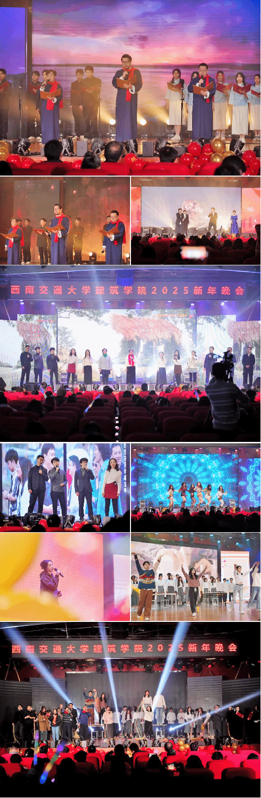 万江、熊瑛、宣湟等师生携手朗诵《相信未来》,激昂词句直击人心,唤起青春勇气。张曦予等6名同学的《舞蹈串烧》融合多元舞风,炫酷技巧嗨翻全场。程仕杰等6名同学深情献唱《有我》,以青春之声唱响担当。风景园林系老师们合唱《送你一朵小红花》,温馨旋律传递关怀与期许。杨孟燃等4位同学带来歌曲串烧《找自己》的迷茫探寻与《陪你度过漫长岁月》的暖心陪伴,引发观众共鸣,建筑系老师们带来《歌舞表演》欢快气氛感染全场。