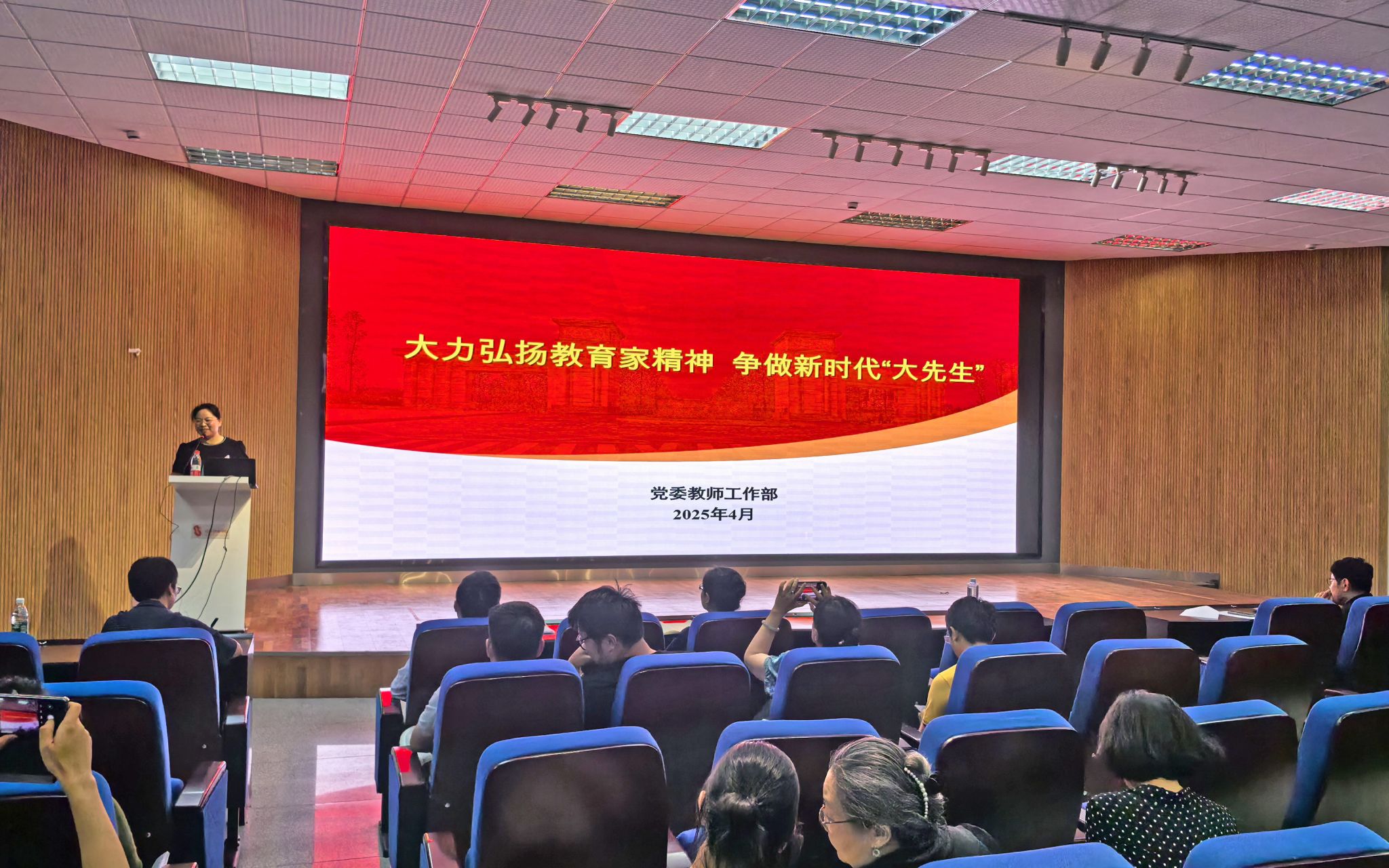 李国芳副书记聚焦教育家精神核心要义,从追求高线,自觉践行教育家精神;守住标线,以十项准则规范行为;远离红线,以案为鉴、警钟长鸣等三个方面,通过钱学森等先进典型的生动事迹,系统阐释了教育家精神在新时代的深刻内涵与实践意义,并剖析负面典型案例,警示教职工时刻自省自查,规范职业行为,为全体教职工带来了一场精彩的讲座,让与会人员深受启发。
