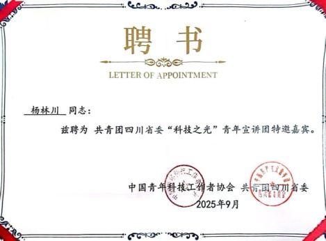 活动结束后,他被中国青年科技工作者协会和共青团四川省委共同聘为“科技之光”青年宣讲团特邀嘉宾,将受邀赴全省各地开展系列示范宣讲活动,进一步普及科技知识,激励学生树立投身建设世界科技强国的远大志向,培养学生爱国情怀、社会责任感、创新精神和实践能力。