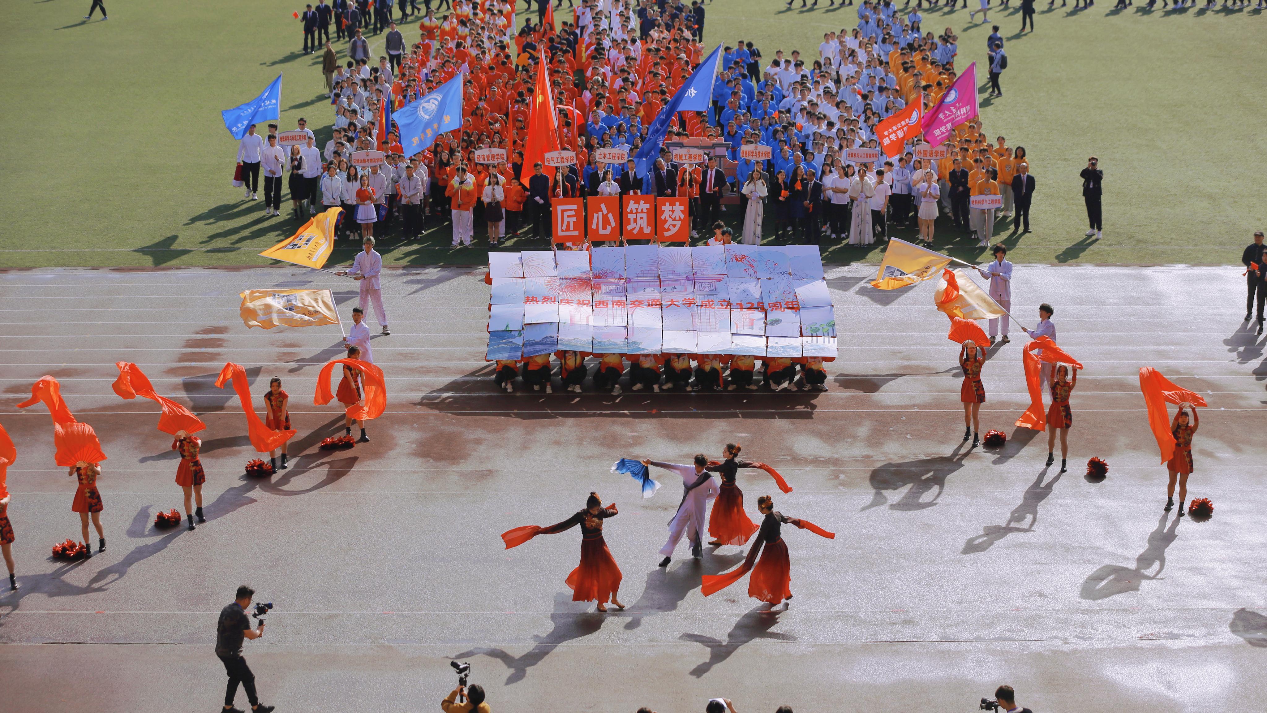 犀浦校区北区田径场开幕。各学院运动员代表队按顺序依次入场,在具有学院特色的音乐背景下,尽情展现着属于大学生的青春与活力,为大家带来了精彩的入场表演。