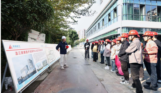 同学们按约定时间在指定地点集合后,一同步行至本次研学目的地——温江健康医疗创新中心A区项目。在技术人员的介绍中,同学们了解到该项目是一座总建筑面积约15万平方米的医疗综合体,建成后将由温江区妇幼保健院与天府街道社区卫生服务中心共同入驻。项目现场正进行二次结构与幕墙施工,恰好为同学们理解智能建造技术提供最直观的实际场景。