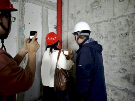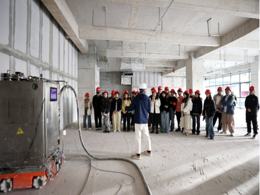 在工地安全员的组织下,同学们有序乘坐智能施工电梯抵达三楼作业区。在“全闭环智能机器人墙面抹灰一次成型施工工法”展示区,同学们首先观摩了机器人的标准作业演示,随后在技术人员指导下分组实践,体验机器人操作流程,切身感受智能设备在提升施工效率与质量方面的显著优势。