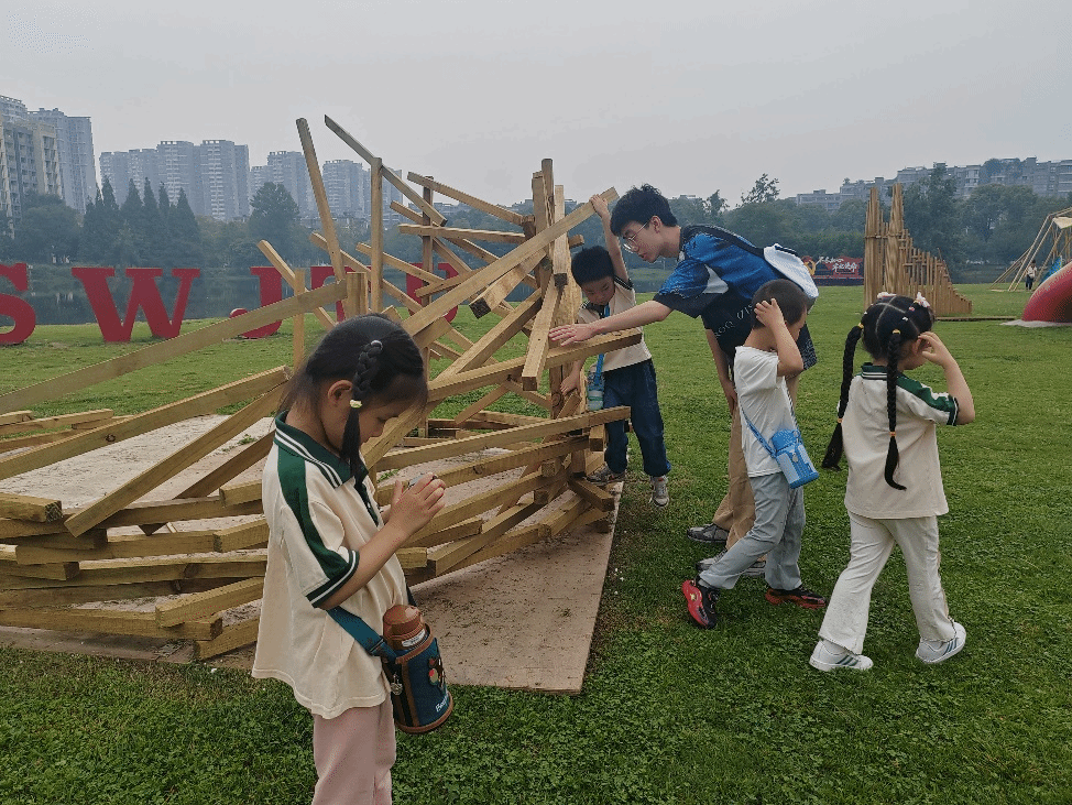 在建造节作品参观中,志愿者用童趣语言讲解大学生设计作品。"看!这座木头做的房子像隧道一样!"小朋友指着建造节作品惊叹。作品中的的镂空设计引发阵阵欢呼,孩子们在触摸中感受材料奥秘。