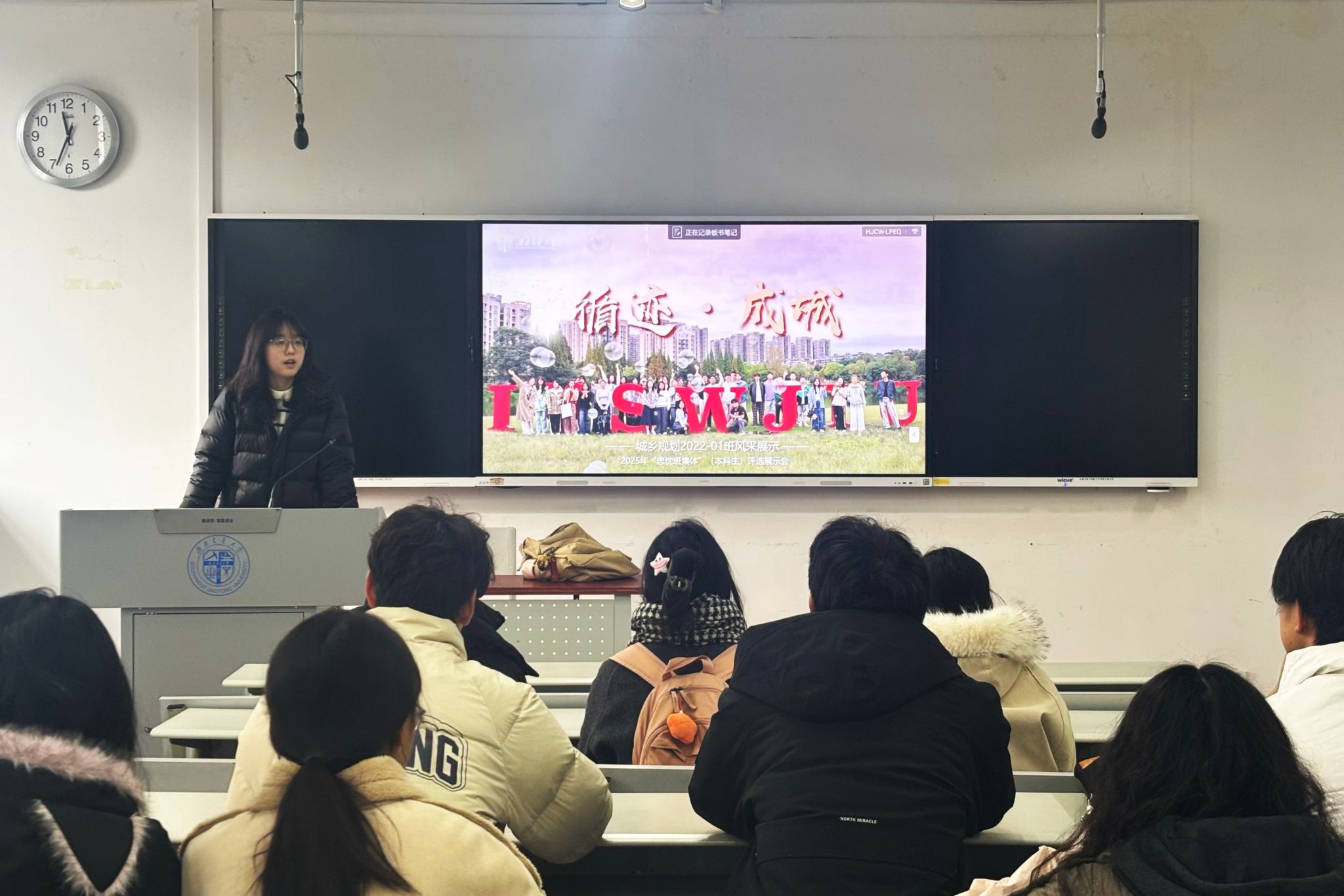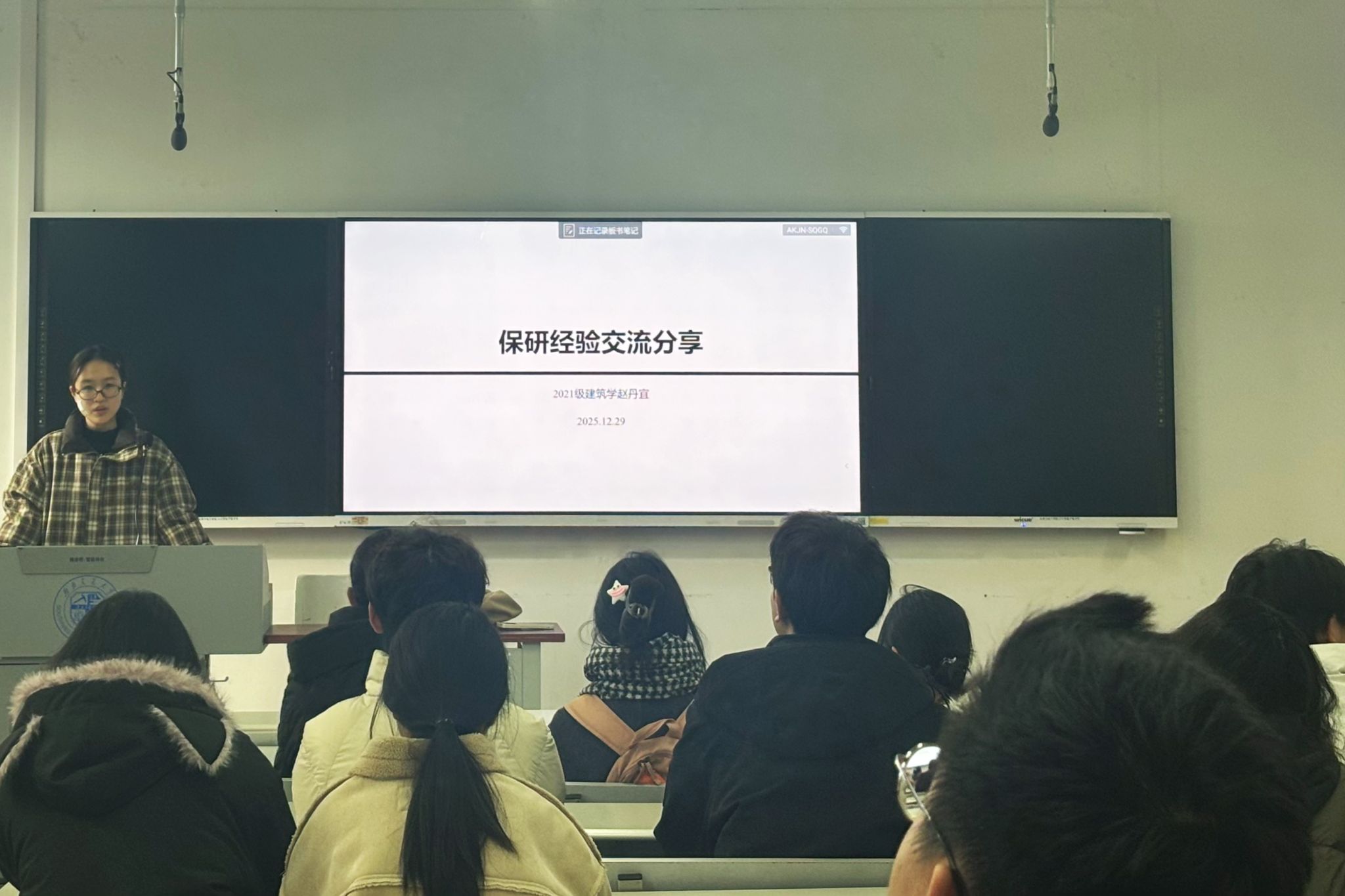 “听建·朋辈新语”分享会于X8521教室举办。活动邀请了“竢实扬华奖章”获得者、建筑学2021级本科生赵丹宜,以及“忠忱班集体”获奖代表、城乡规划2022级本科生张伊珺,为同学们分享经验与心得。