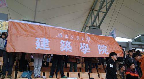 看台上的拉拉队拉条幅、呐喊为参赛运动员们加油!