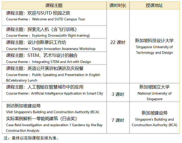 本次研学课程由新加坡科技设计大学与新加坡国立大学杰出导师匠心策划, 6个课程主题,共计32课时。课程涵盖前沿科技课程、企业探访及实地探索特 色标杆项目三大核心模块,学习智能制造、智能建造、新能源、智慧交通和城市 设计等多个领域的知识,并通过实践项目将这些知识融会贯通,为解决实际问题提供创新方案。