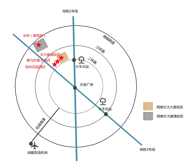 也可叫出租车从酒店到西南交大犀浦校区西二门,约30-40分钟,下车后步行5-10分钟到建筑馆会场。