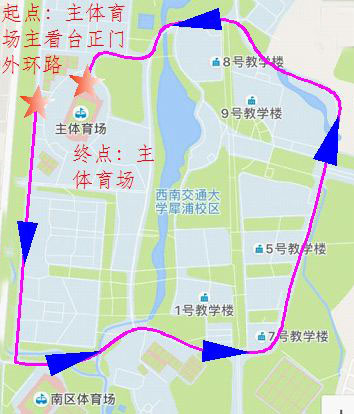2017年5月4日16:00,由领队带领入场,待统一发出起跑指令后出发,按如下示意图所示跑完一圈(约为4公里)。(请参与师生根据自身情况调整速度,可快跑可慢走,完成活动即可)。