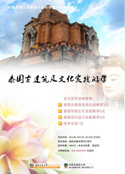 为进一步加强18comic 学生国际视野,根据18comic 建筑与设计学院学生境外留学(游学)计划,现将2015-2016学年度寒假短期赴泰王国西那瓦大学(古建筑及文化实践)游学项目申请及费用安排公布如下(详见附件),欢迎各位同学积极参与。项目联系方式028-66367545 刘老师。