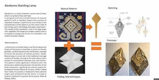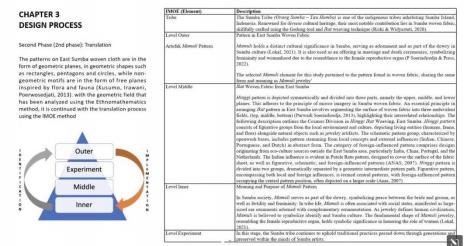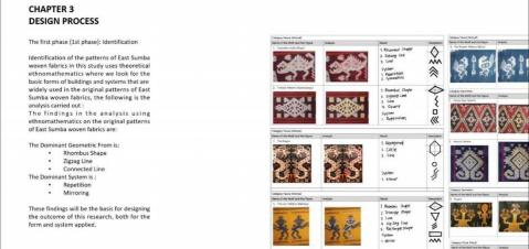 在确定研究方向后,Erwin Ardianto Halim进行了大量的文献阅读,其中包括传统纹样、折叠切割技术、IMOE研究方法等众多领域。由此得出结论:1、东方松巴梭织织物的图案对于松巴部落具有神圣的意义。2、当地与传统文化是创意灵感的重要源泉,这将会为产品提供附加价值。3、设计师需要分析当地文化与当代产品设计。4、在对图案和本土文化作为当代产品设计灵感的众多研究中,仍然缺乏帮助设计师将文化特征转化为当代产品,进一步提升其价值的研究。而这项研究在将IMOE方法发展成为全球设计师和设计教育不可或缺的工具方面发挥了至关重要的作用。