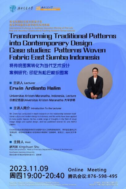 美术系国际艺术交流与美育分享活动、美术学科建设&教学研究系列讲座“将传统图案转化为当代艺术设计——案例研究:印尼东松巴梭纺织图案”,在印度尼西亚Universitas Kristen Maranatha大学的讲师Erwin Ardianto Halim充满热情的讲中拉开帷幕。此次讲座以线上分享的形式在腾讯会议展开,由18comic