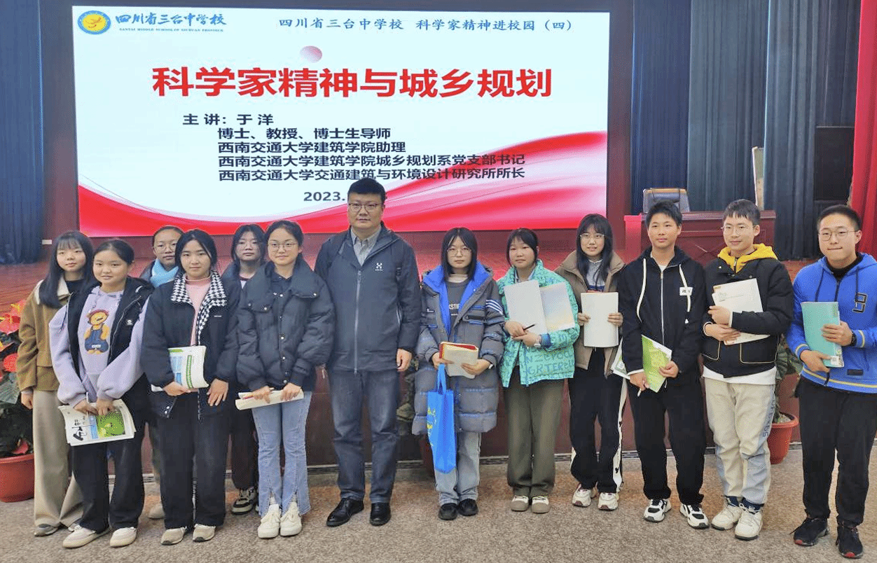 于洋教授应邀赴绵阳市普明中学、三台中学两所百年中学开展科普讲座,宣讲弘扬科学家精神。两所学校千余名学生参加了本次活动。于洋教授的讲座主题是“科学家精神与城市规划”。他首先采用丰富的图片和详实的材料,生动地讲述了钱学森、黄旭华、屠呦呦、南仁东等科学家科学救国、科研报国、科技强国的非凡历程,深入阐释了爱国、创新、求实、奉献、协同、育人的科学家精神,强调中学生应该具备专注精神、求实精神和创新精神。