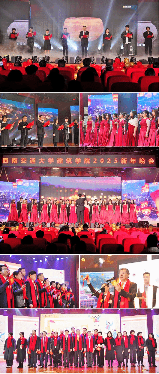 绘画系老师们的诗朗诵《何以华夏 何以中国》气势磅礴,回溯华夏文明,激荡家国情怀。橙・合唱团高歌《灯火里的中国》,雄浑歌声颂祖国昌盛,深情祝福满溢。晚会尾声,学院领导班子与行政人员、学生携手登台,《我和我的建筑梦》唱响师生对建筑事业的赤诚热爱,凝聚奋进力量。