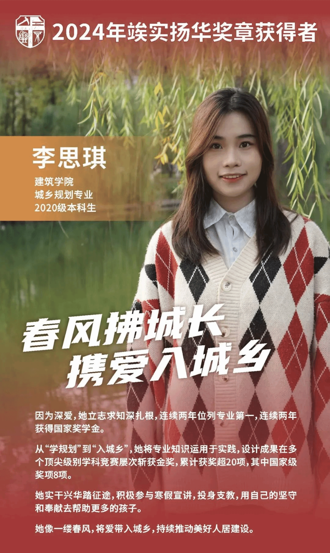从“学规划”到“入城乡”,她将专业知识运用于实践,以己所学解人民所需。设计成果在多个顶尖级别学科竞赛屡次斩获金奖,累计获奖超20项,获得国家级奖项8项、省级奖项13项。在科研领域,她追寻先辈足迹,弘扬建筑文化,参与省级SRTP科创项目,赴成都青白江区曾家老寨参与10余次古建测绘踏勘,通过三维手段完成2个古建筑群的数字化智慧展示。她还发表了两篇一作会议论文,推进城市存量提质增效、关注环城绿道景观格局演变,心系民生改善,助力城乡发展。立志于“尽精微”中“致广大”,持续推动美好人居建设