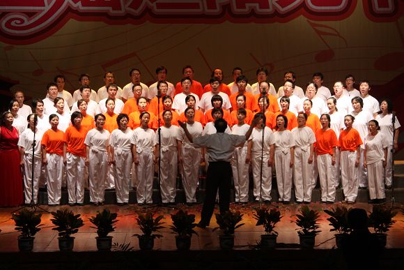 教职工代表队了,这是由全体院领导参与,包括退休教师共60位老师组成的队伍,指挥陈大乾老师,领唱毕凌岚老师,朗诵周斯翔老师。他们意气风发走上舞台,英姿飒爽,容光焕发,将精心准备的两首歌曲——《今天是你的生日,中国》、《歌唱祖国》,用浓浓的深情,演绎得淋漓尽致。无论是体现建筑特色的配色“A”字队形,激昂处的歌唱转接,还是领唱和朗诵的巧妙配合,都得到了现场观众热烈的掌声。值得注目的是, 18comic