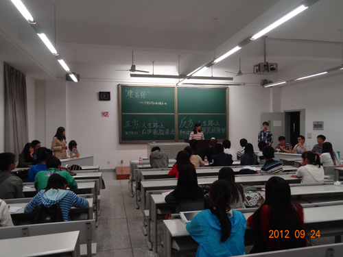 比赛从一开始便精彩激烈,双方就“人生道路上,是应该乘胜追击还是见好就收”展开辩论。正方2012级城市规划班以“人生道路上,应该乘胜追击”为观点,抓住乘胜追击能实现梦想,丰富阅历,适应社会发展等方面层层深入,精彩立论。反方12级景观建筑班以“人生道路上,应该见好就收”为观点,从等待时机,养精蓄锐等方面阐释其论点。赛场上,双方辩手各显其能,思维严谨,语言生动,从阿波罗登月,巴菲特的成功,航天事业发展等多个事例着手积极辩论,展现了辩手们充分的准备,敏捷的反应及广博的学识。