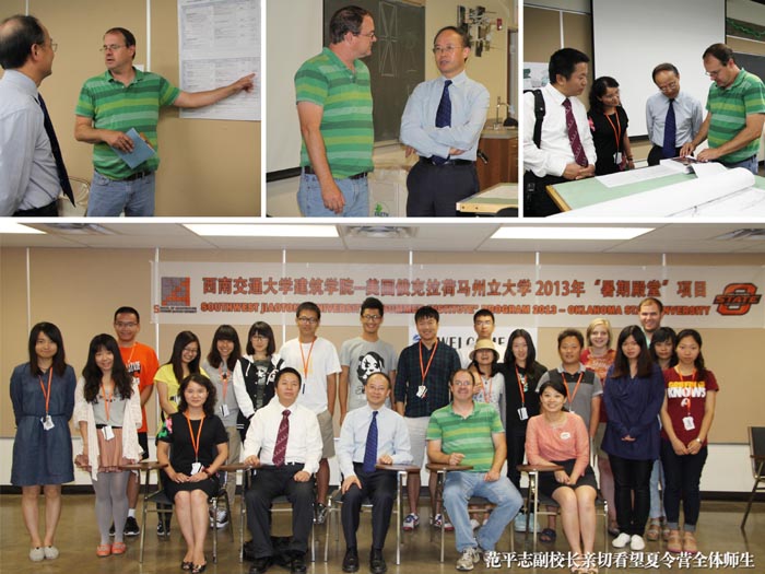 7月25日,正在OSU交流访问的范平志副校长和国际合作与交流处邱延峻处长专门抽时间到夏令营设计课教室看望了夏令营全体师生。范校长亲切询问了同学们的学习、生活情况,详细了解了暑期殿堂项目的课程内容、实践和参观环节以及后续活动的开展情况,与中美双方的指导教师进行了深入的交流,当了解到2012年暑期殿堂项目的交流合作设计作业有2项入选中国建筑学会全国建筑高校大学生国际交流作业展后,范校长对本项目的成果给与了高度肯定,鼓励同学们再接再厉,欣然与全体师生合影留念。