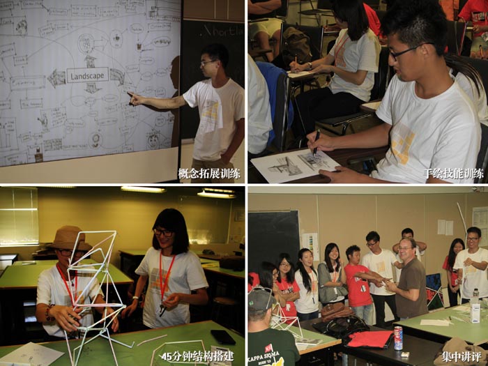 专业类课程以“景观.建筑”概念拓展为开端,引导同学们自由拓展对本专业的认识和理解。其后,同学们兴致勃勃地参加了“45分钟——结构搭建”、“徒手表达技法与户外写生”等专业基本技能的训练。美方教授独特的教学方法和思路,让同学们在快乐的实践中,巩固了专业基本技能,而夏令营同学们的空间创意和手绘表达能力,也给美方教授留下了深刻的印象。
