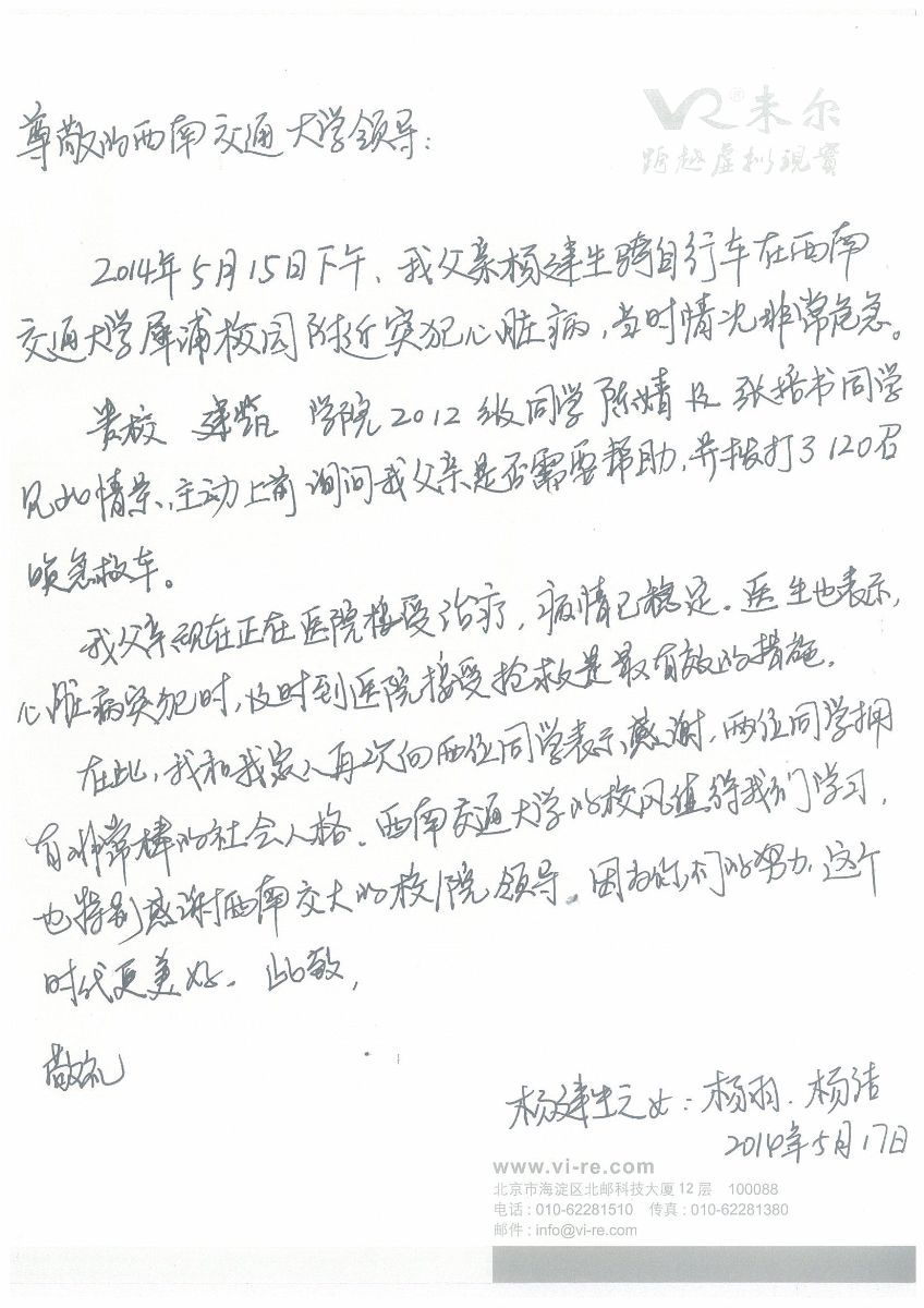 5月15日下午16时左右,杨老先生骑车在西南交大犀浦校区游玩时,突发心脏病后坐在路边。此时,刚下课的陈婧和张培书同学途径此处看到这一幕。“看到那位老人就在离我们不远处表现的很痛苦的样子,就赶紧跑过去询问老人。”陈婧同学这样说道,在问清情况之后,才得知老人是心脏病复发,情况危急之下她们赶紧拨打急救电话。几分钟后,急救车赶到并将老人送往医院进行救治,她们才松了一口气。