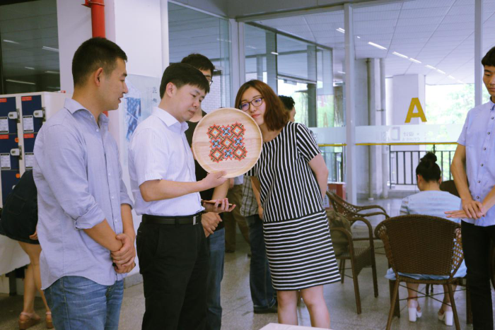 学院玻璃展厅内,各色展品玲琅满目。展品一部分是由缪根生老师指导13级环艺一班同学们制作的木盘绣,它是用“十字挑花”刺绣技法把图案绣到木盘上,由缪老师首创。另一部分展品是由王玮老师指导13级环艺二班同学们制作的扎染作品,还有一部分是历届的优秀扎染作品及LT手作创意设计社团成员制作的扎染作品。这些作品制作工艺复杂,耗时长,受到了到场嘉宾的青睐。