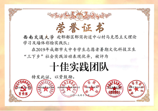 2019年暑期“三下乡”赴成都郫都区郫筒街道中心村“特色乡村建设——马克思主义理论学习及墙体彩绘”实践团队在1139支团队中脱颖而出,被评为成都市“十佳实践团队”称号,团队指导老师被评为“十佳指导教师”称号,本年度十佳队伍共计10支、十佳指导教师10人,来自多所高校,18comic