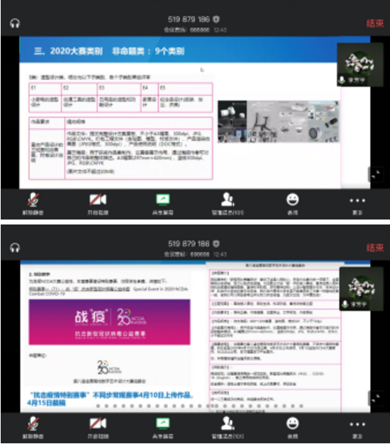 上午10:00点,由杨青娟副院长主持会议,“第八届全国高校数字艺术大赛”获奖作品分享会准时在云端召开,来自全院多个专业的一百多位师生在线登陆会议室,共聚分享会。会议首先邀请了教务处刘朝晖副处长连线指导,权威发布了学校相关鼓励政策。来自产品设计系的李芳宇老师、苟锐老师,视觉传达专业的陈立民老师三位大赛优秀指导老师,分享他们的参赛指导经验,为师生带来了精彩的讲解。首先,李芳宇老师对大赛基本情况、本届赛制及特别比赛单元“抗击新型冠状病毒公益赛事”做了解析,详细介绍了比赛流程及注意事项,对同学们在解题、创作、作品上传、合作组队等方面进行了特色分享。其次,陈立民老师则从优秀案例分析的角度,就作品创意、选题思考、企业命题特点、文案撰写等方面,进行了详尽拆解,将国内外其他重要赛事、主要美术院校线上资源引入此次分享讲解。最后,苟锐老师作为2019年华灿奖一等奖指导老师,带来获奖作品的创作过程分享,并从参赛必杀技、创作逻辑、设计“术”与“道”等角度深入分析,三位老师的讲解精彩纷呈,同时又紧密贴合参赛过程中的实际问题,可谓是为同学们带来了一场赛前的最佳热身。