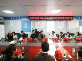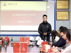 实地参观结束后,同学们有序前往项目部会议室。首先由成都建工第八建筑工程有限公司科技质量部副部长王恒对本次研学活动致欢迎辞,并对本次研学活动的意义给予了高度肯定。随后,由讲解员围绕项目中应用的智能建造技术,系统介绍了其项目初期面临的技术难点、建造中运用的智能建造体系及相关设施,帮助同学们将现场的直观感受与智能建造体系的应用知识相结合。